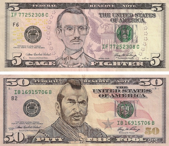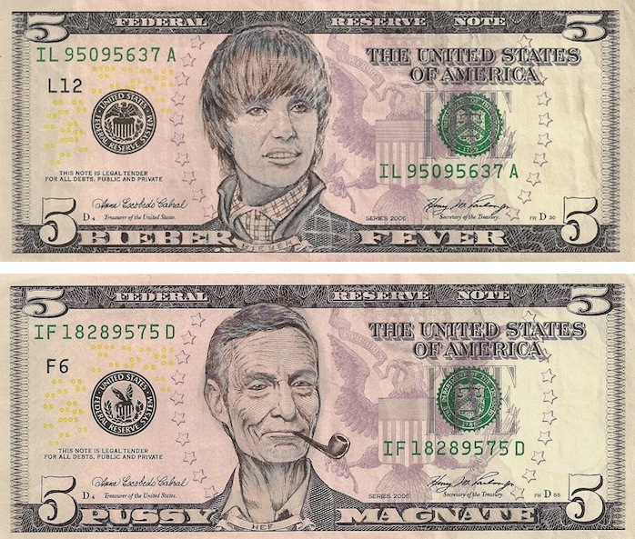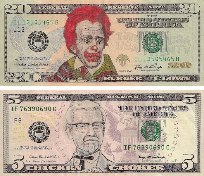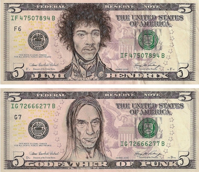 “As of last year, artist James Charles has been engrossed in an interesting new project; small in scale…but large in depth. He began drawing on dollar bills, for the sake of his own amusement; crudely altering the presidents’ faces to become monsters, celebrities, etc. After accidentally spending a few of his early pieces, James decided to stop carrying them in his wallet, and started putting them inside of a magazine for safe-keeping. The magazine folder eventually became a large scrapbook, showcasing bills of all denominations. He found ink and materials to match perfectly what the U.S. Mint uses on the bank notes, and began to experiment with ways to alter the font and script along the bottom of the bills. It became the perfect way for James to inject an additional layer of wit.