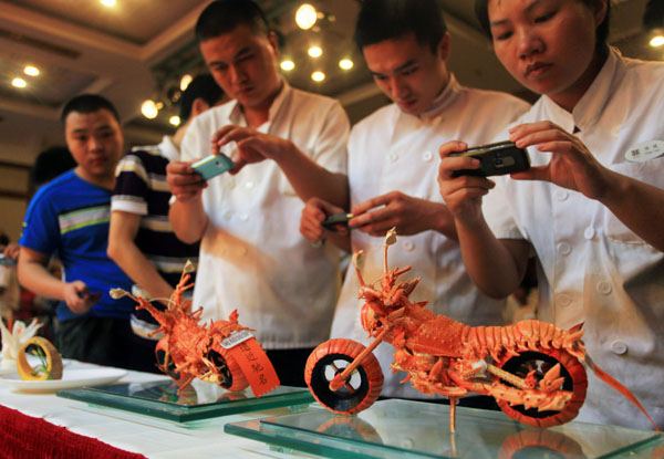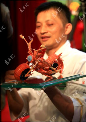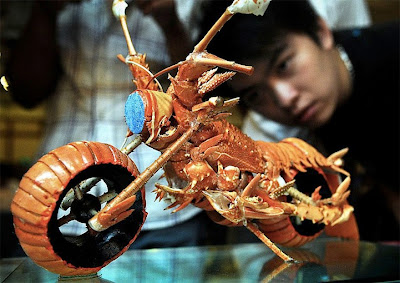This motorcycle made from lobster shells was created by Taiwanese chef and food carving artist Huang Mingbo at a seminar on cooking art in Fuzhou, southeast China’s Fujian province. We’ve seen motorcycle sculptures made from some unusual materials, but we can honestly say this is the first time we’ve seen one made from a crustacean.