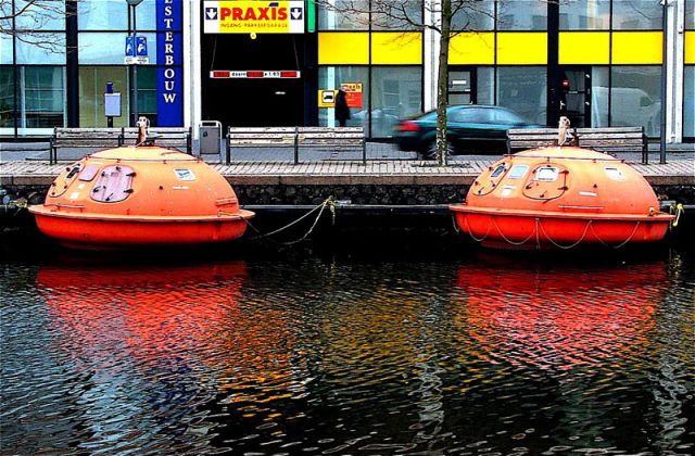 Moored in F.A.S.T. (Free Architecture Surf Terrain) – a unique and artistic surfers village at the boulevard of Scheveningen near The Hague, Netherlands, your room is a bright orange survival pod made from travelling oil rig survival capsules. Originally built in 1972 they are 4.25 metres in diameter and unaltered apart from the addition of a lock on the outside and an ‘emergency’ chemical toilet inside. While not everyone’s luxury choice, each pod provides cosy protection from the elements for up to three occupants.