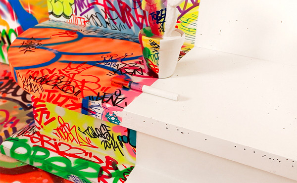 Tilt divided the room perfectly down the middle, one half covered entirely in his trademark vibrant and bubbly graffiti and the other half left stark white.
