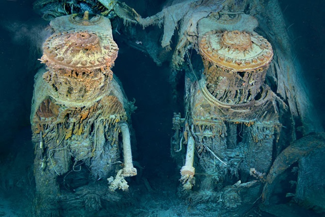 Two of Titanic's engines lie exposed in a gaping cross section of the stern. Draped in "rusticles" - orange stalactites created by iron-eating bacteria - these massive structures, four stories tall, once powered the largest moving man-made object on Earth.